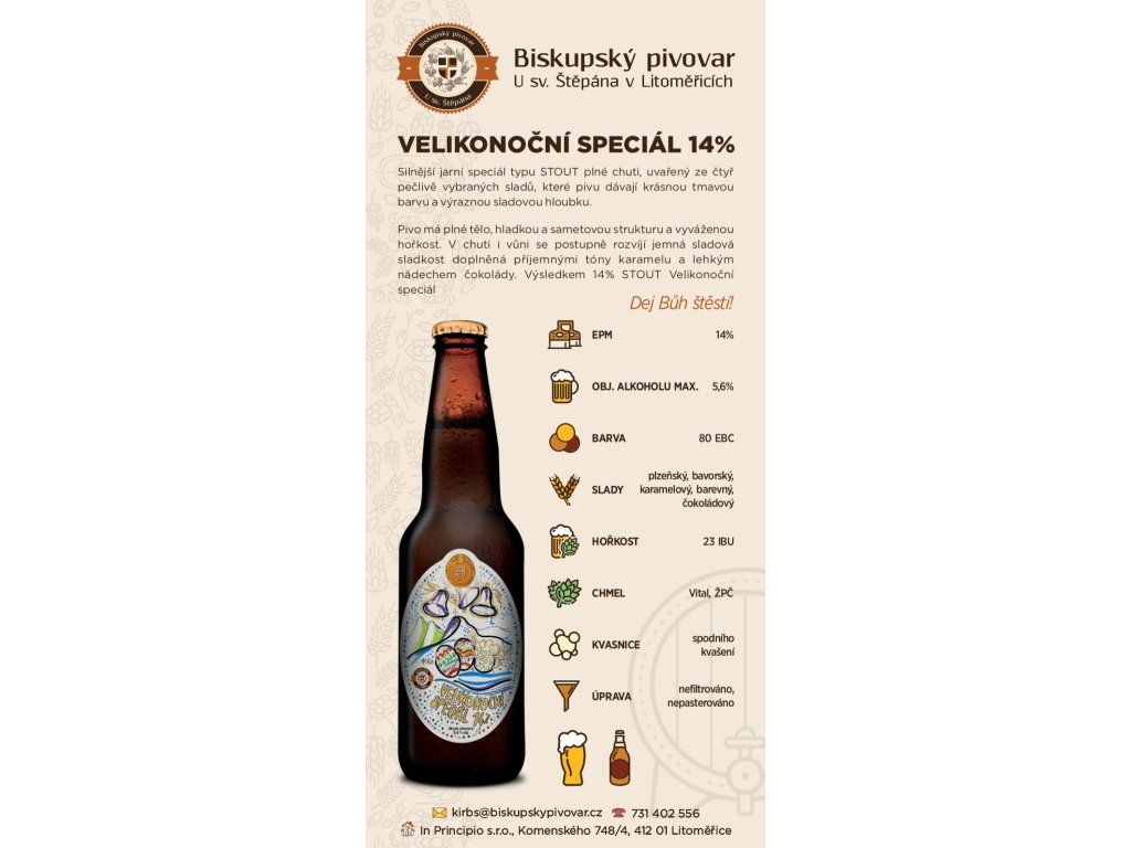 Velikonoční speciál 14% STOUT uvařený ze čtyř sladů, spodně kvašený. Nefiltrovaný, nepasterovaný, obj. akoholu max. 5,6%.